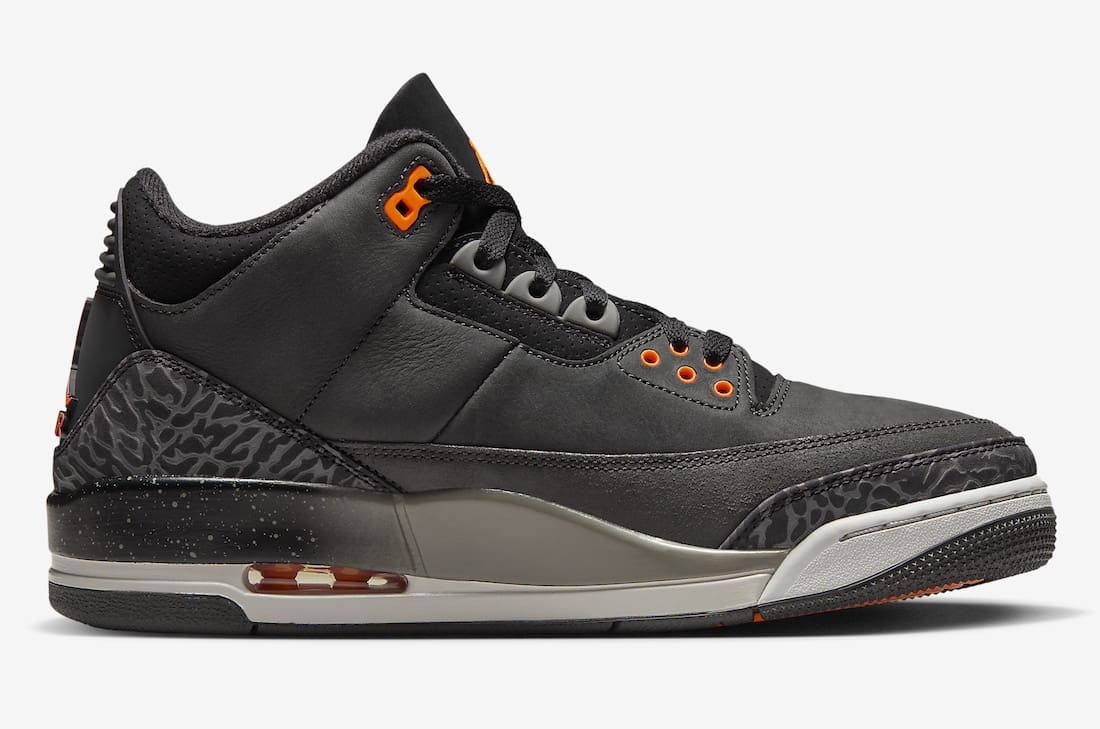 The Air Jordan 3 Fear comes dressed in a Night Stadium, Total Orange, and Black color scheme. It is given a premium Dark Grey suede upper placed on top of a speckled Black and White midsole in the rear atop a Black rubber outsole. The Dark suede upper is decorated with while elephant print overlays take care of the toe and heels. It also comes with insoles nodding to the “Look Me In My Eyes” commercial reading, “I’m scared of what I won’t become, and you’re scared of what I could become.”