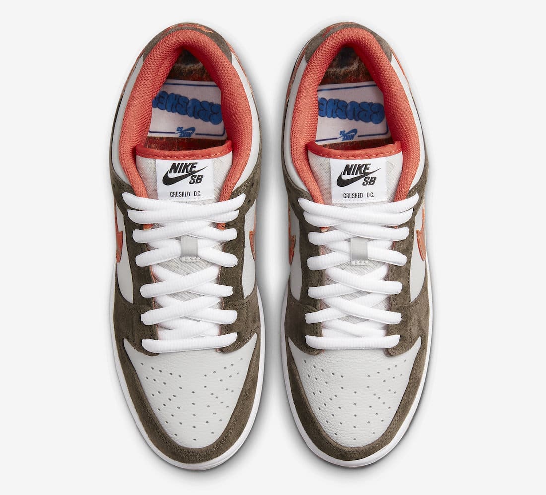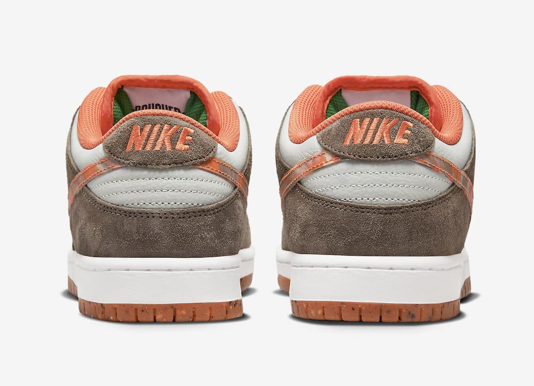The Crushed Skate Shop x Nike SB Dunk Low comes dressed in a White tumbled leather upper contrasted by the dusty Brown suede overlays. Elsewhere you will find Orange, marbleized-styled Swooshes as well as a matching outsole that’s equipped with Nike Grind speckling. Additional Orange hits land on the lining and tongue border, while Green takes care of the inside of the tongue. Dual branding on the tongue tags complete the look.