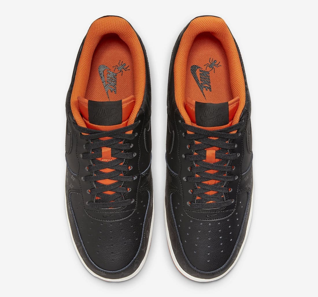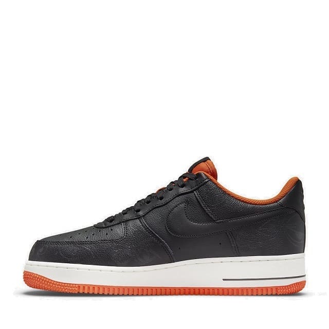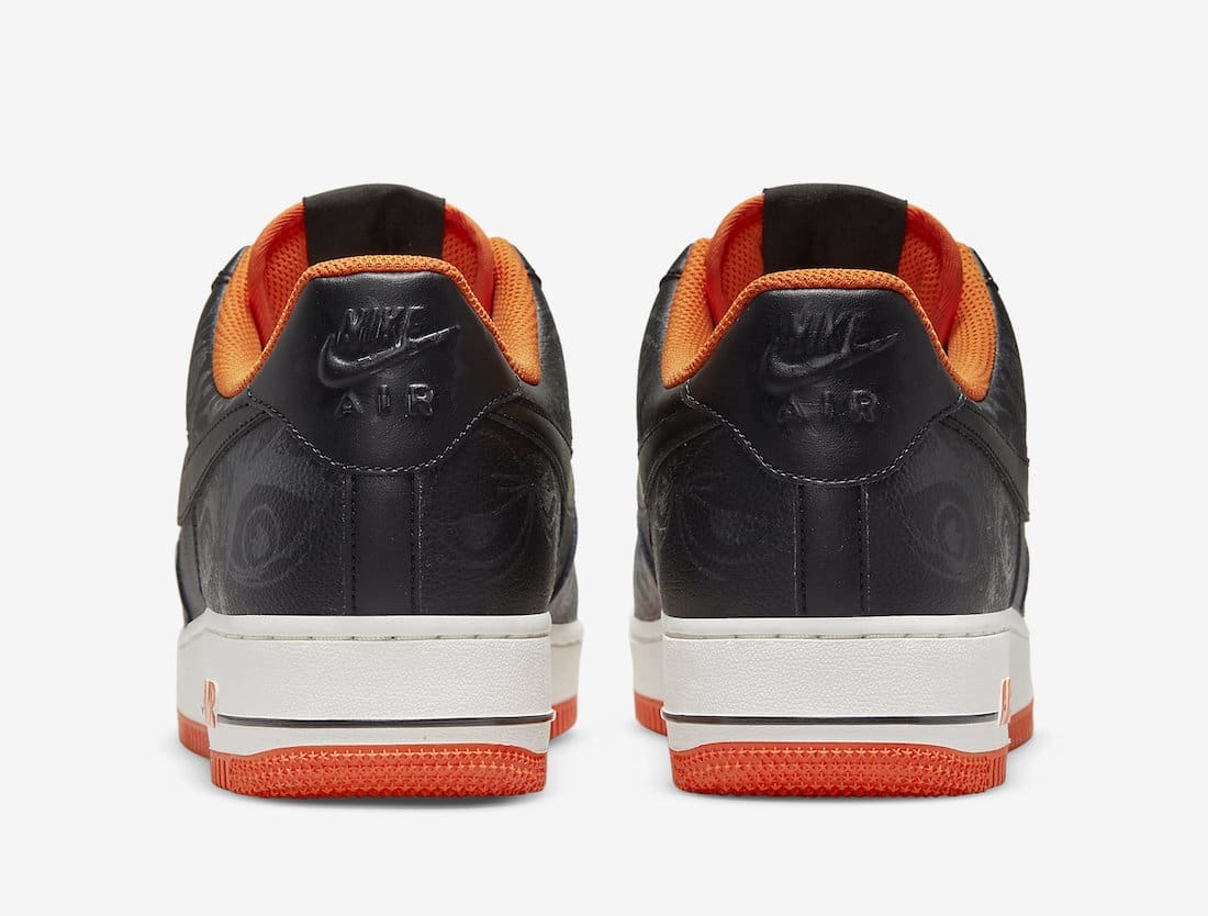 Dressed in a Black, Starfish, and Sail color scheme. This Nike Air Force 1 features a Black upper detailed with glow-in-the-dark owl eyes resembling the spooky holiday. Orange contrasting accents and rubber sole atop a Sail midsole completes the design.