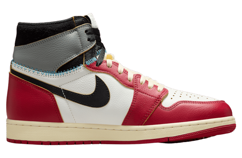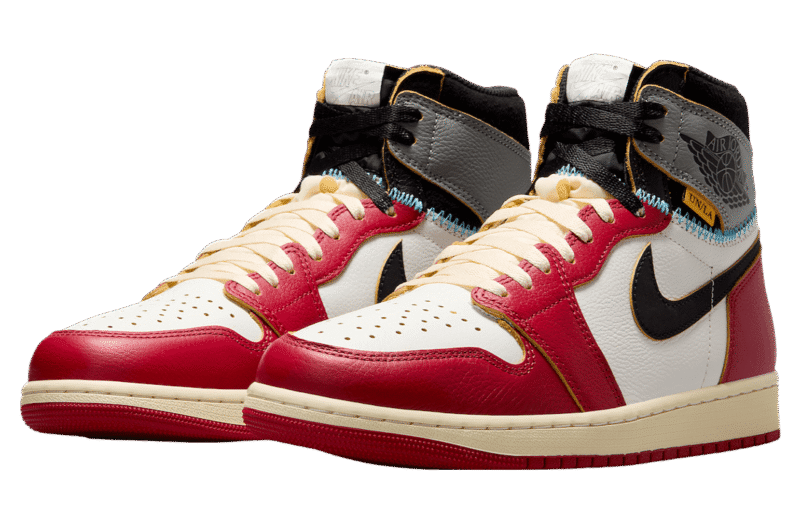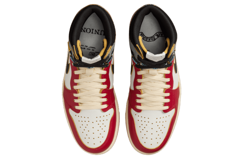 The shoe features a crisp white leather base with Varsity Red overlays. The black Swoosh contrasts the upper, staying true to classic Jordan DNA. A grey and black ankle collar, inspired by the “Shadow” edition, adds a unique touch. Union’s signature exposed zigzag stitching connects the panels, delivering a deconstructed look. Additional branding includes the Wings logo, a yellow “UN/LA” tag, and a Nike Air-branded tongue with exposed foam padding. The pre-yellowed midsole enhances the vintage aesthetic, creating a worn-in appeal.