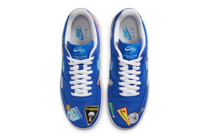 Landing in “Racer Blue/University Blue-White,” this take on the Air Force 1 Low finds itself covered in thematic patches. While “Racer Blue” lands on the canvas upper alongside “University Blue” Swooshes, each shoe features Nike designs both old and new throughout. References to Los Angeles stand out as the focal point of the upper, including one which names the coastal neighborhood of San Pedro. An “Anniversary Edition” tongue combines with white at the trim, laces and sole unit to complete this celebratory look.