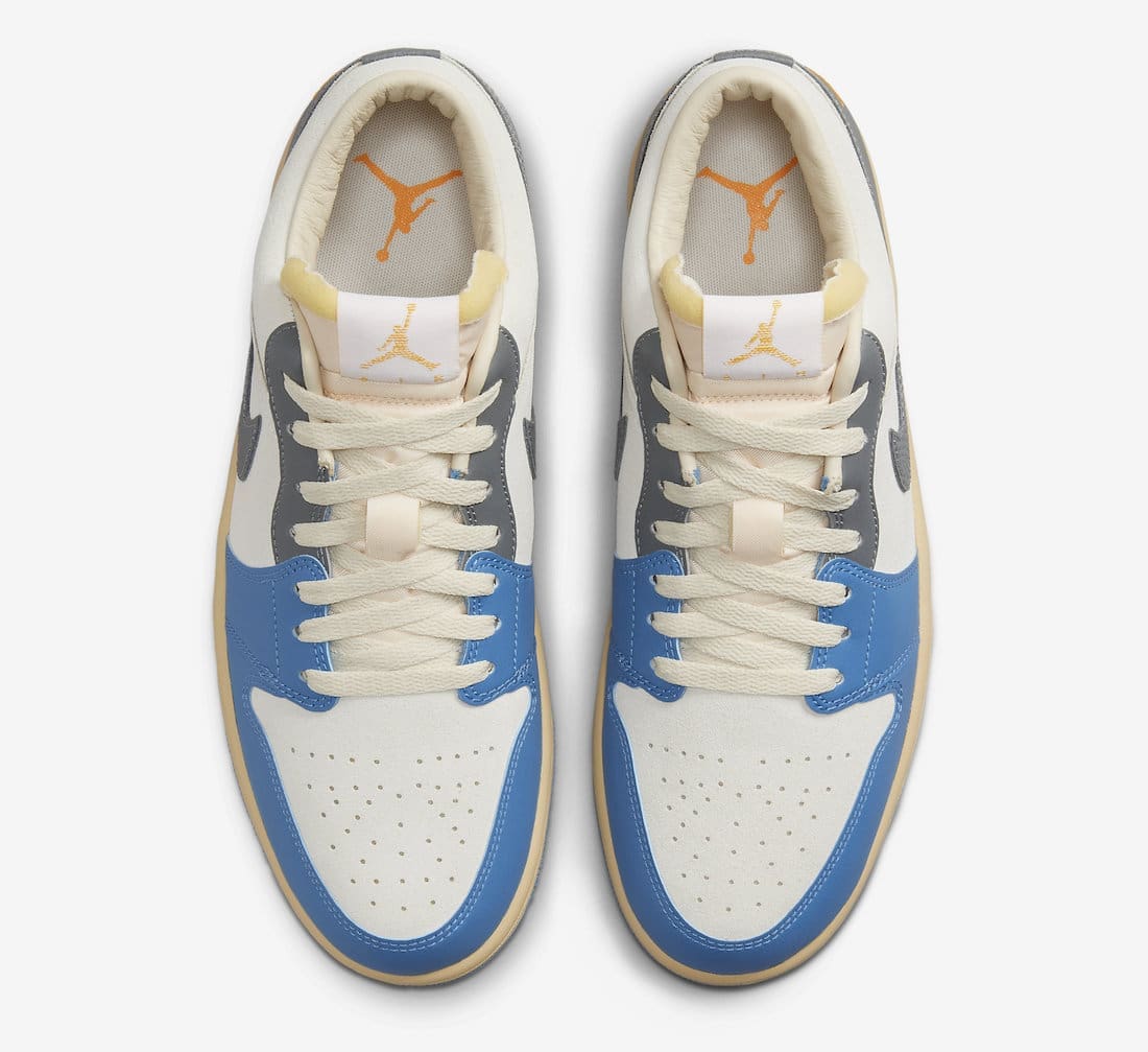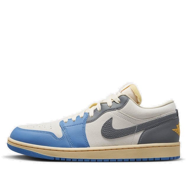 Dressed in a White, University Blue, Grey, and Sail color scheme. This offering of the low-top Air Jordan 1 features a White leather base with Blue overlays up front and Grey in the rear to give it that popular split design that was used on the Union AJ1s. Other details includes padded tongues, Yellow Wings on the heels atop an aged midsole and Blue rubber outsole.