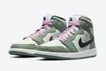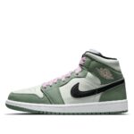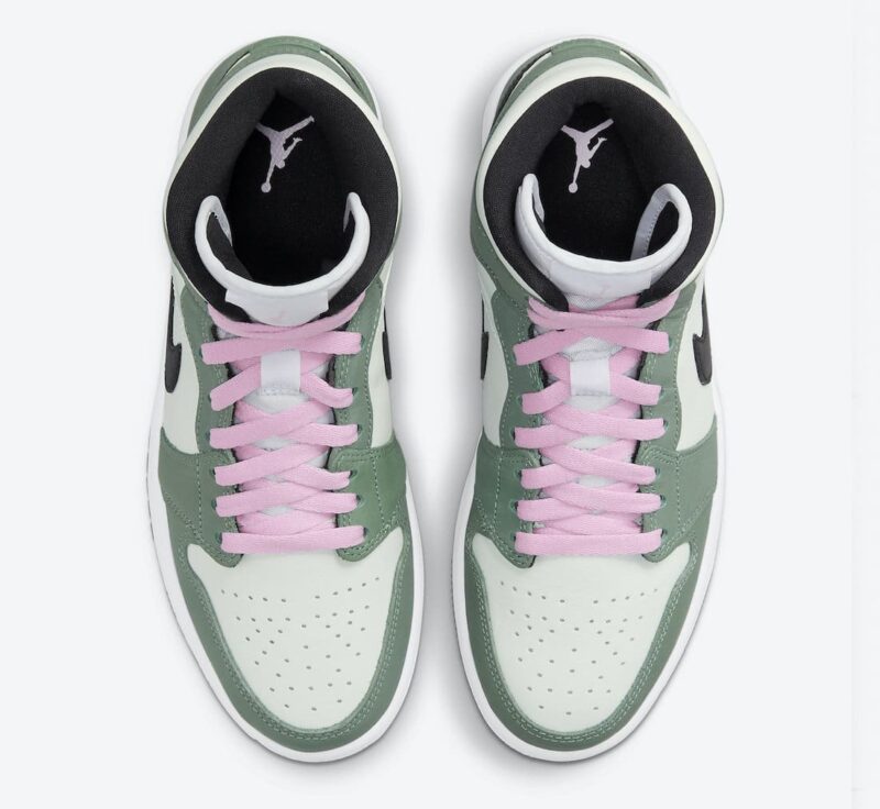 Dressed in a Dutch Green, Black, and Barely Green color scheme. This mid-top Air Jordan 1 features a Barely Green leather base with Dutch Green overlays paired with Black leather Swooshes. The shoe is completed with a set of Pink laces atop a White midsole and Green rubber outsole.