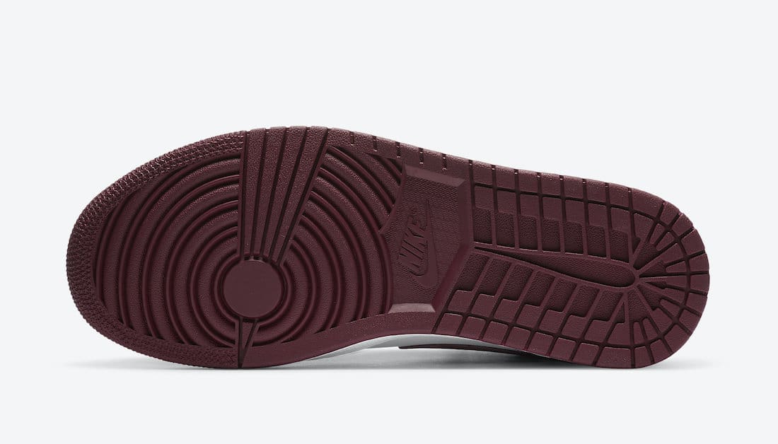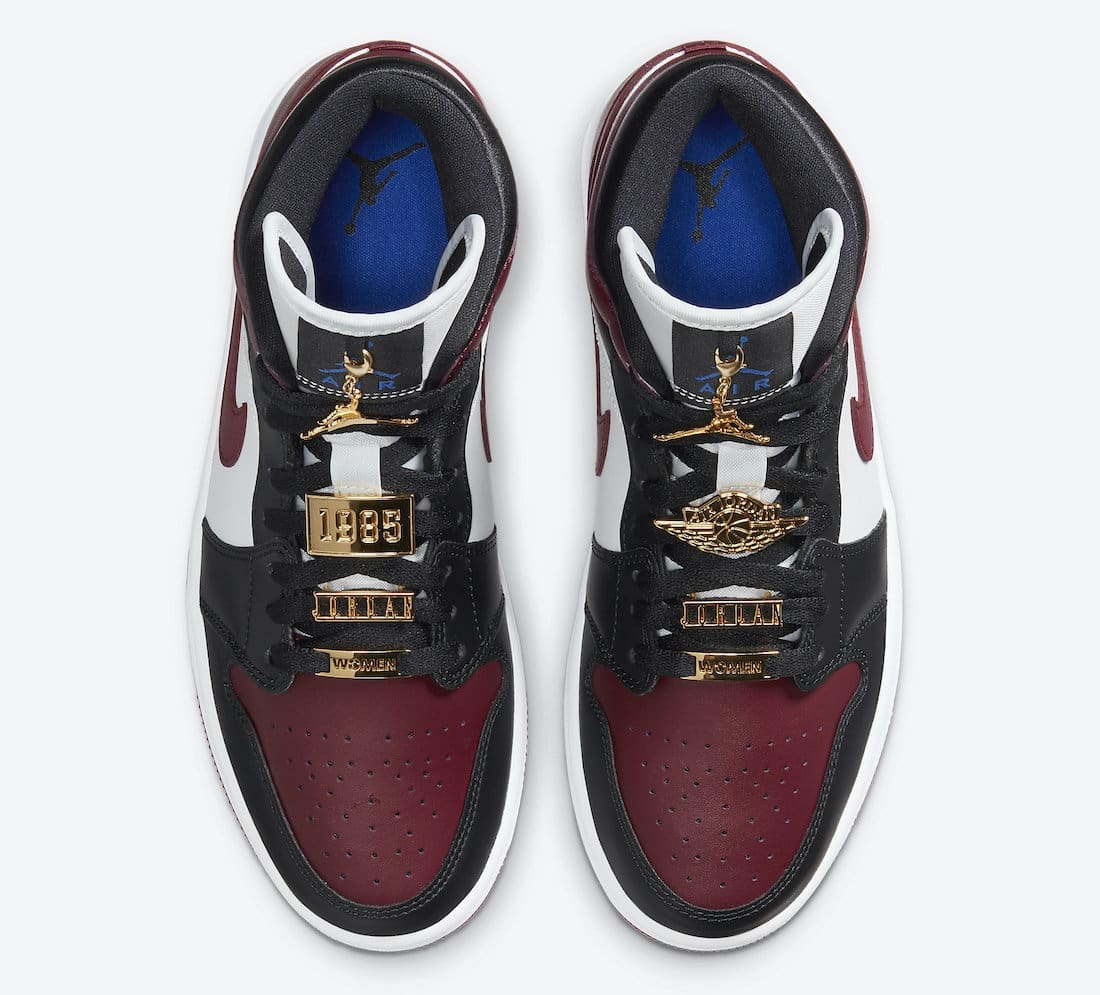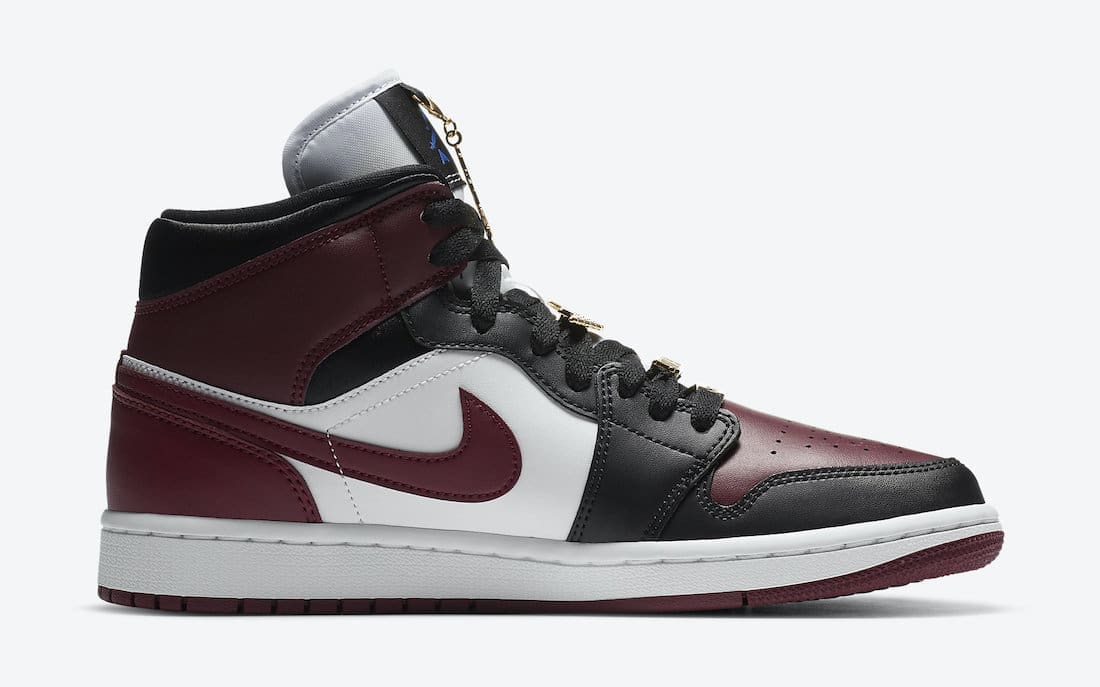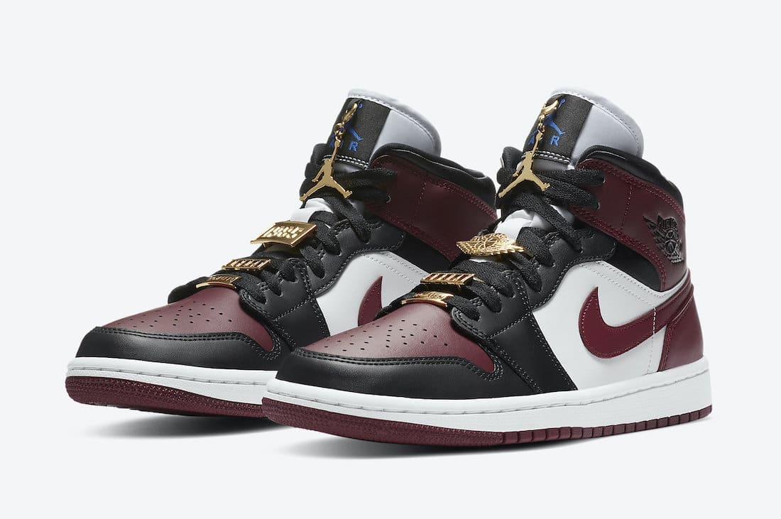 This offering of the mid-top Air Jordan 1 comes constructed in full leather build featuring White side panels and midsole, Black overlays, and Dark Red toe box, Swooshes, ankle flap, heels and outsole. Blue branding tongues and insoles with four Gold pendants appearing tongues and laces completes the design.