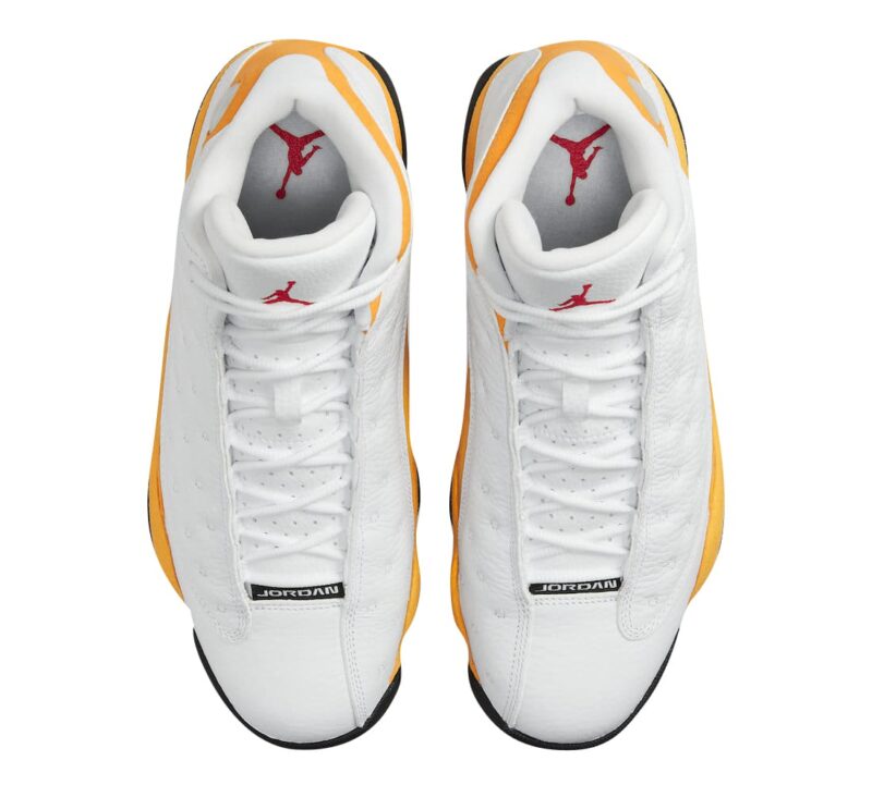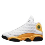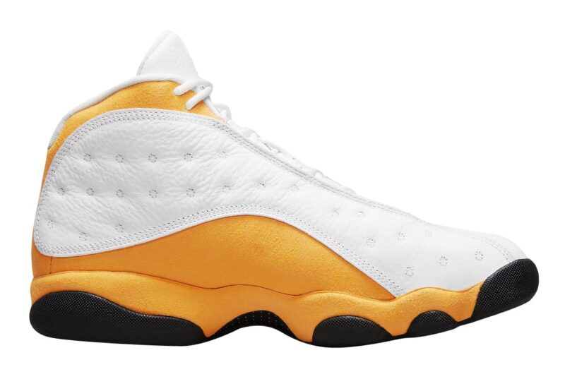 This “Del Sol” iteration of the Air Jordan 13 comes dressed in a White, University Red, Del Sol, and Black color scheme. Opting for a clean base, the sneaker dons White leather on the panels, toe, and tongues with a matching liner. Adding a vibrant aesthetic to the sneaker are the hits of Yellow (Del Sol) noted on the suede overlays, while hits of Red are spotted on the Jumpman on the tongue. White laces and a Black rubber sole complete the look.