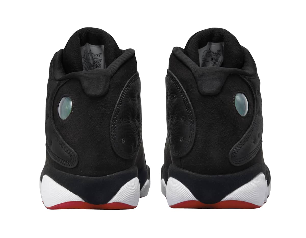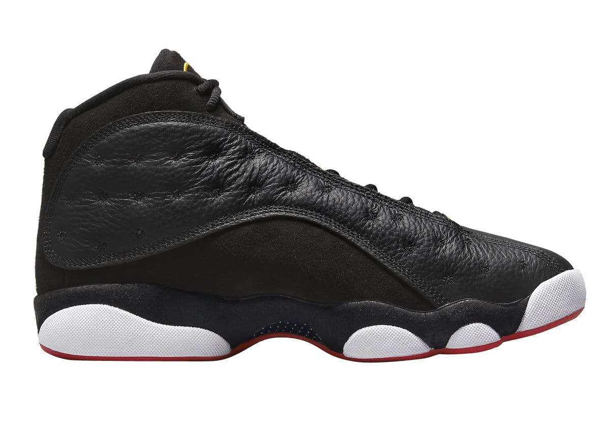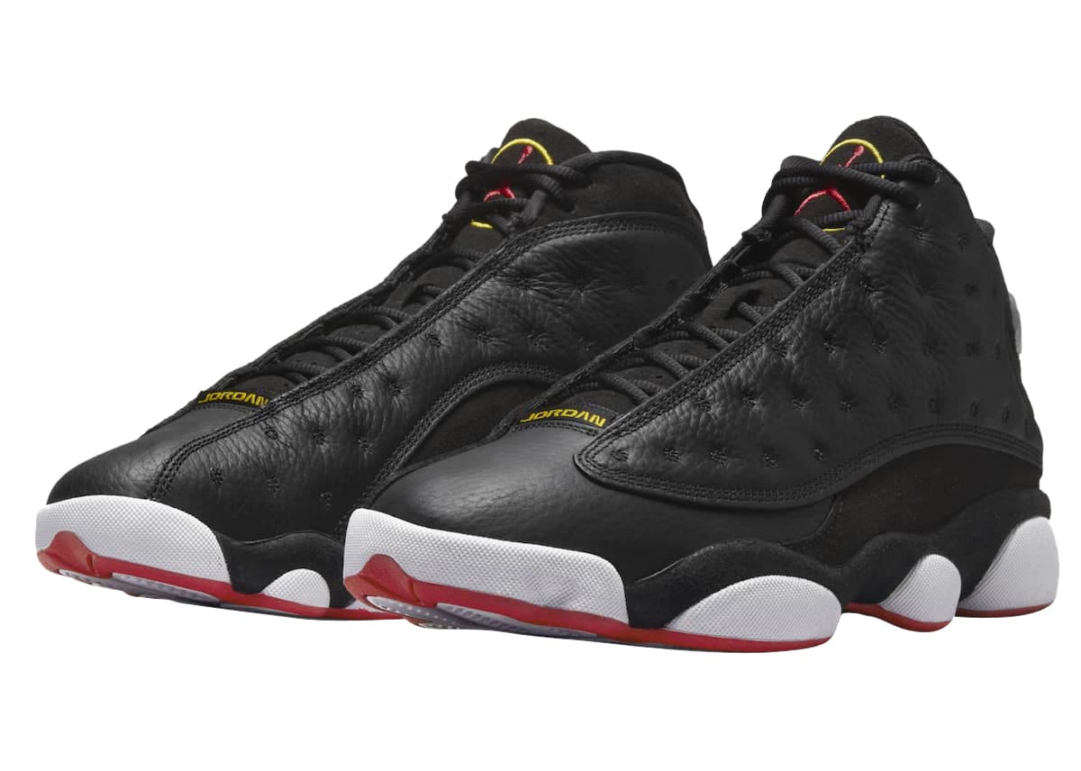The Air Jordan 13 Playoffs 2023 looks identical the the OG pair from 1998 with its Black, True Red, and White color scheme. Black tumbled leather with tonal suede overlays comprise its base while yellow and red accents throughout, followed by a white midsole and red rubber outsole round out the style.