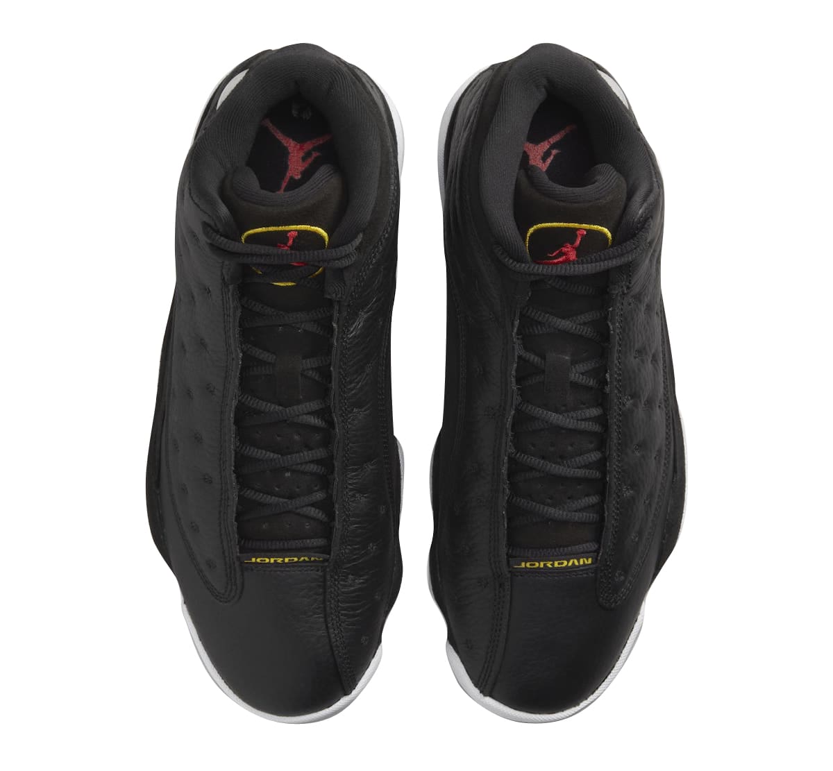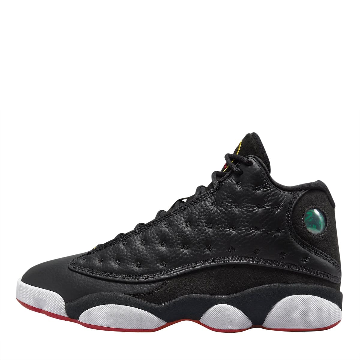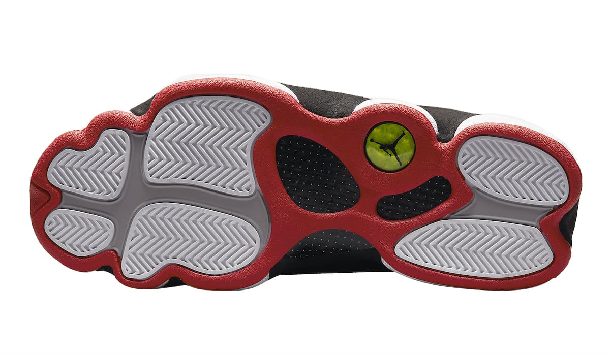 The Air Jordan 13 Playoffs 2023 looks identical the the OG pair from 1998 with its Black, True Red, and White color scheme. Black tumbled leather with tonal suede overlays comprise its base while yellow and red accents throughout, followed by a white midsole and red rubber outsole round out the style.