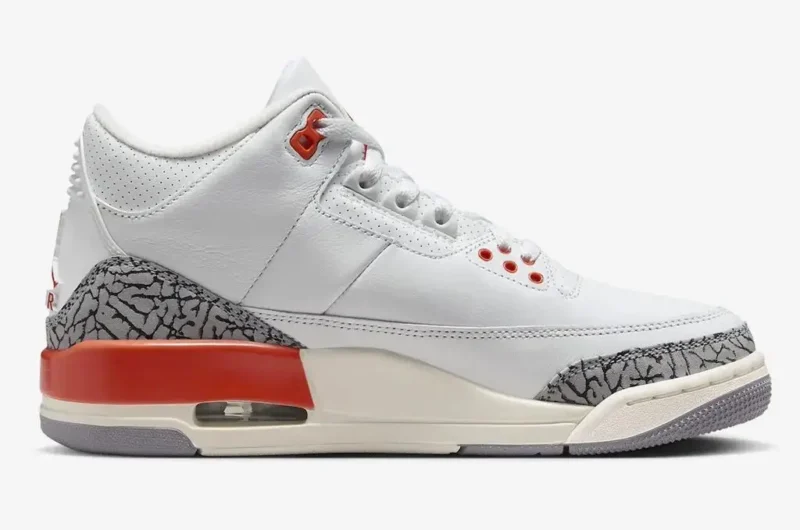 This “Georgia Peach” edition combines a pleasing palette of White, Cosmic Clay, Sail, Cement Grey, and Anthracite. It features a White leather upper with the customary ankle and eyestay perforations. The design will be further enhanced with Cosmic Clay accents on the midsole, Jumpman branding on the tongues and eyelets, evoking the delightful appearance of the peach fruit. A Cement Grey rubber outsole will round off the shoe’s look atop a Sail midsole.