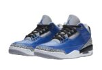 The Air Jordan 3 Blue Cement comes with an official color scheme listed as Varsity Royal/Varsity Royal-Cement Grey. It comes with a Varsity Royal tumbled leather upper with elephant print overlays. Adding some contrast to the shoe is the Black detailing found on parts of the shoe such as the laces, heel tab and part of the midsole. White accents are also found on the rest of the midsole and the Jumpman branding on the heel. Cement Grey takes care of the lining, eyestay, tongue, most of the outsole and collar.