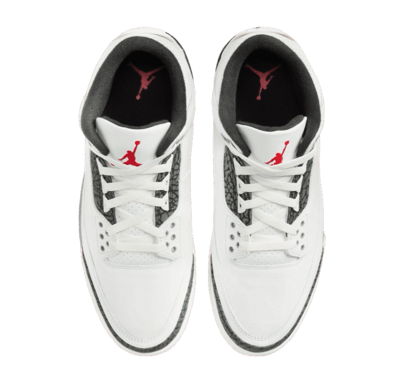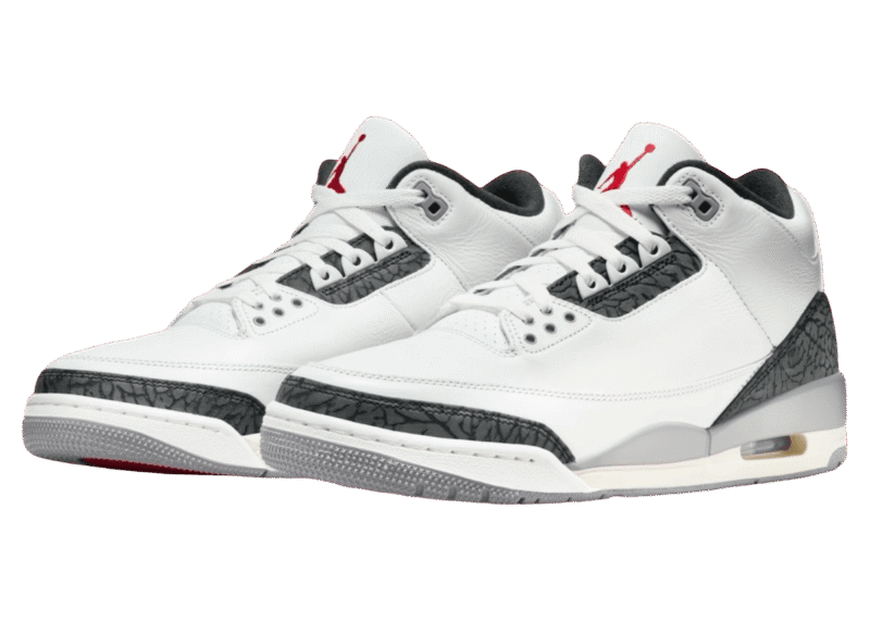 The Air Jordan 3, featuring a crisp White tumbled leather base, draws attention with vibrant Fire Red accents on the iconic Jumpman logos adorning the tongues while Black covers the heel tabs. Adding a touch of familiarity, Cement Grey embellishes the eyelets, inner lining, and a section of the midsole. The classic elephant print in a darker hue maintains its original placements on the eyestay, toe, and heel overlays.
