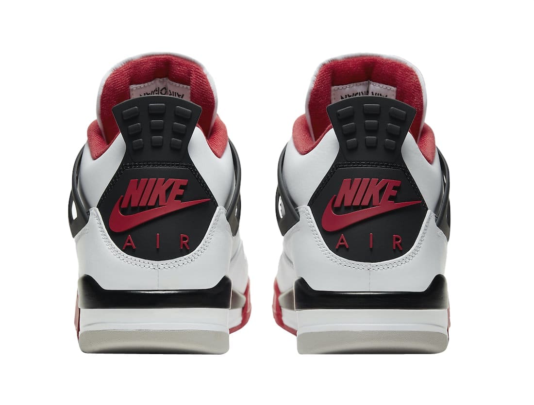 This Jordan 4 consists of a White leather upper with details in black and fire red. Mesh rubber underlays, black heel tabs with “Nike Air” branding, and black with fire red midsoles complete this design.