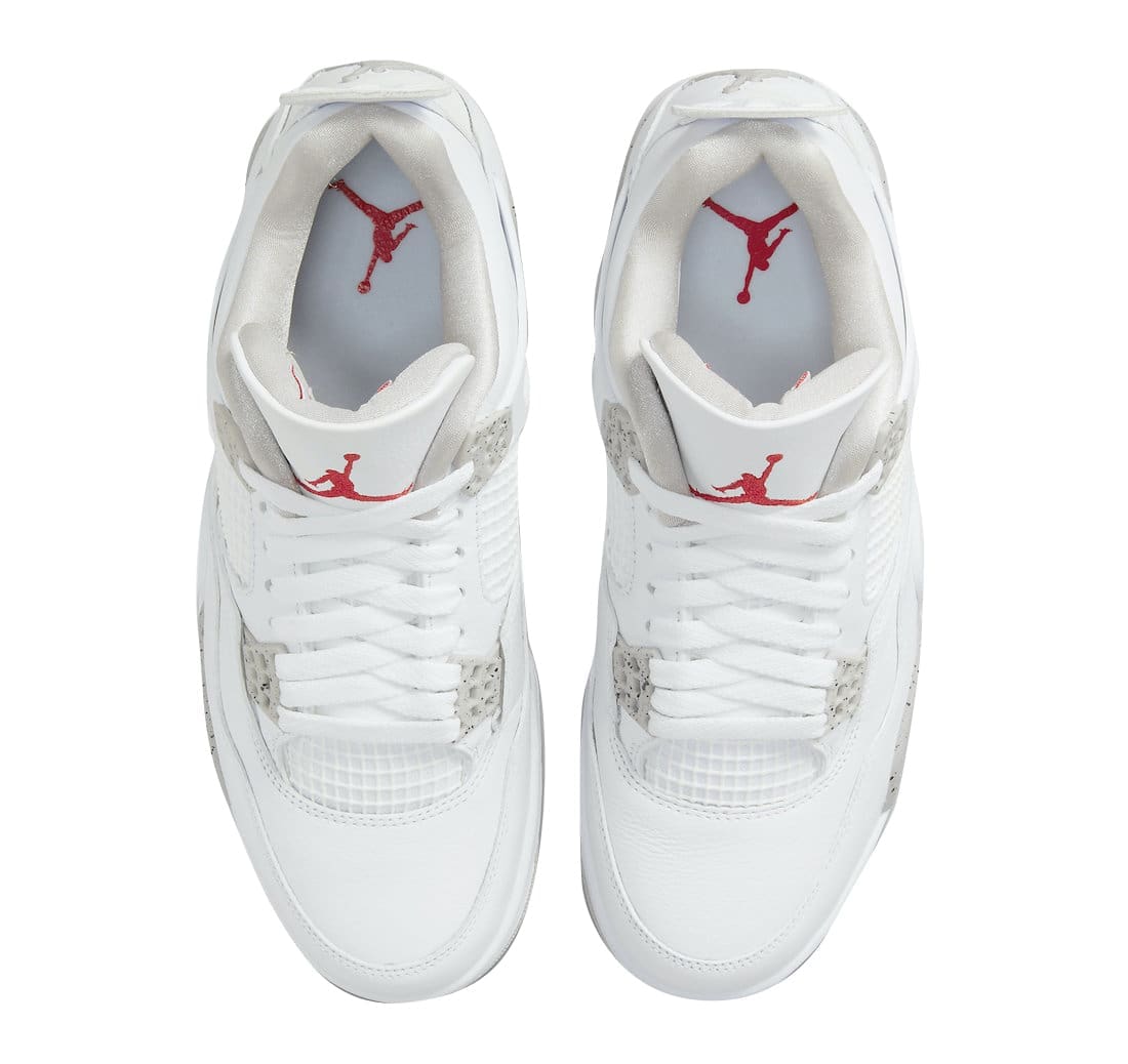 The Air Jordan 4 “White Oreo” is an iteration of the popular silhouette and it’s notably inspired by the Air Jordan 4 “Oreo” but in whiteout version.The model sports a pristine tumbled leather and mesh construction while speckled Cement Grey adorns the plastic eyelets and midsole. Tonal light grey adorns the inner lining, Jumpman logo on the heel and frontal portion of its rubber outsole, while red Jumpman logos on the tongue, insole and outsole tops off the design.