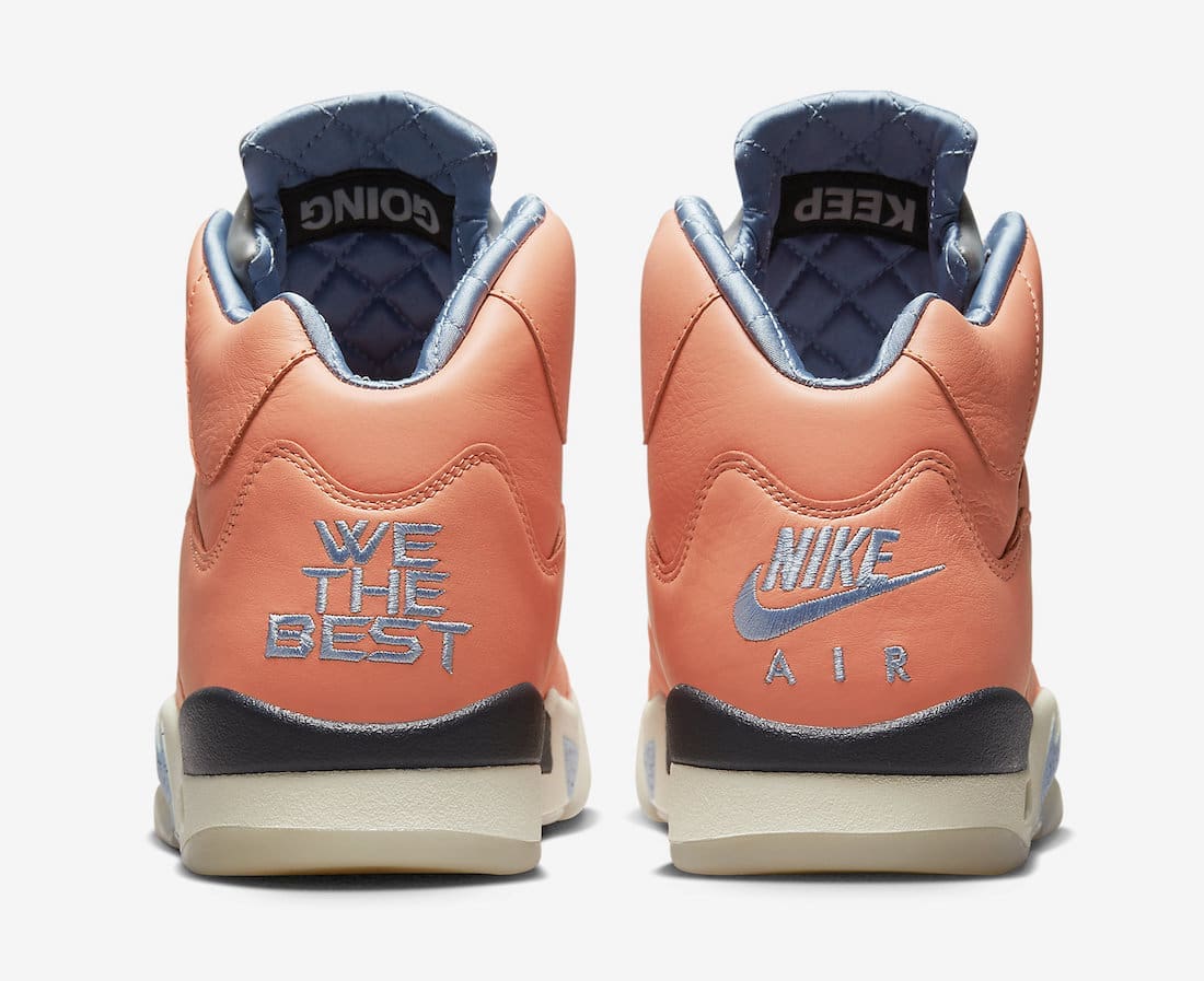 This collection includes four Air Jordan 5 color options dressed in Crimson Bliss, Sail, Blue, and Bright Purple hues. Each pair features leather uppers, colorful contrasting accents, “We The Best” and “Nike Air” branded heels, quilted inner lining with “Keep” and “Going” labels on the inner tongues. Finishing off the design are translucent outsoles with “We The Best” underfoot of the right shoe. Each pair comes housed in special box/packaging.