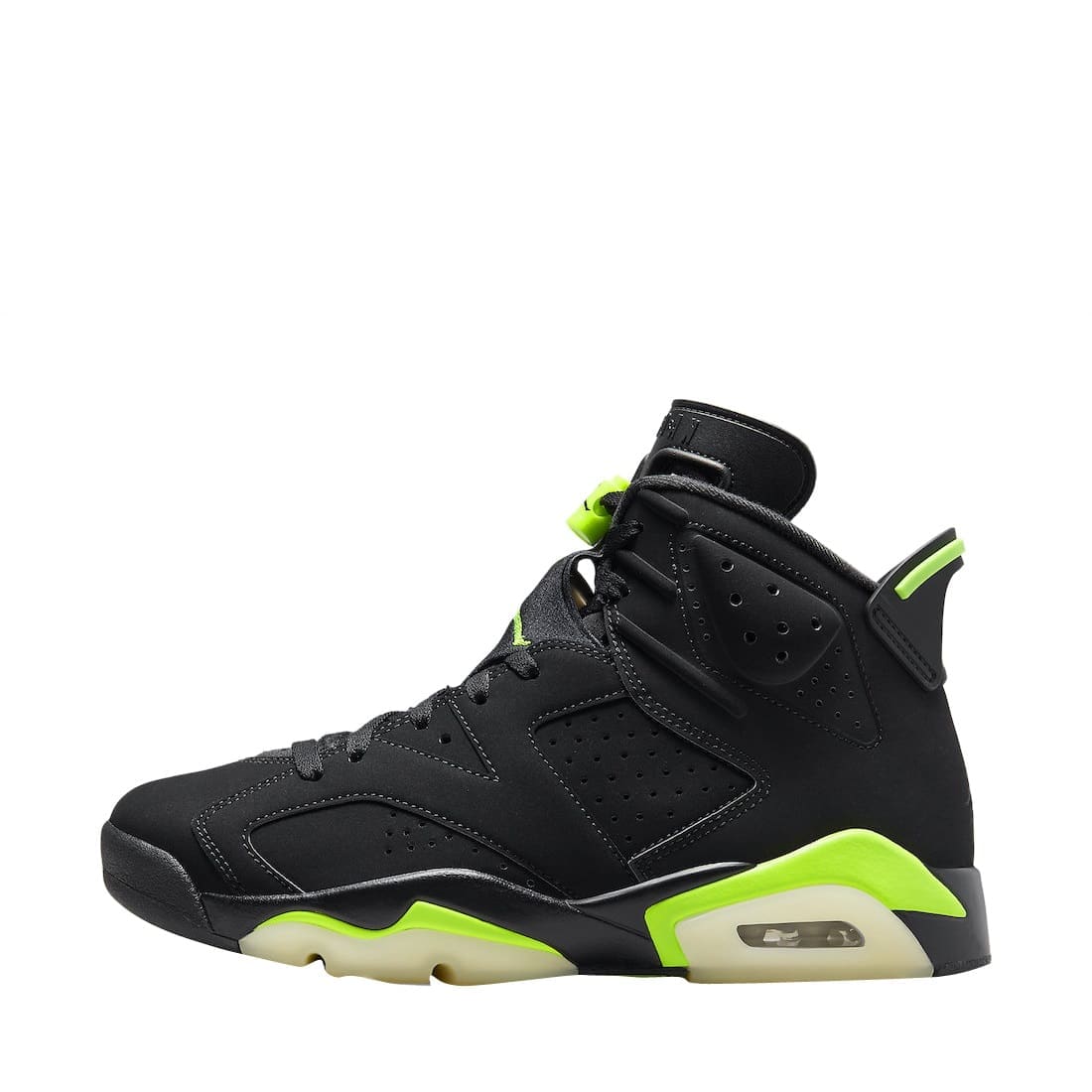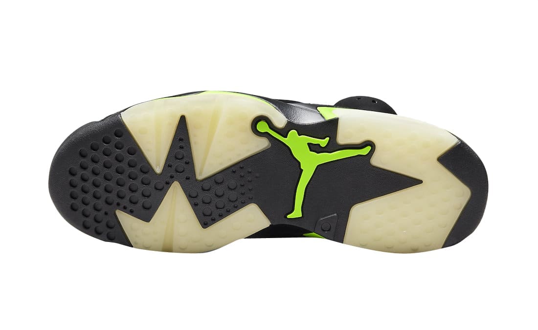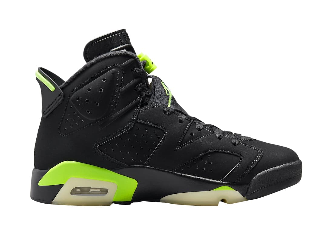 Opting for a simple color blocking, this Air Jordan 6 starts off with a Black base done in nubuck construction with the signature perforations placed throughout the shoe. The defining Electric Green hue is then placed on the Jumpman branding on the tongue, lace locks, midsole, and heel tab. A black midsole, and a black rubber outsole with translucent detailing and a green Jumpman finish things off on this Air Jordan 6.