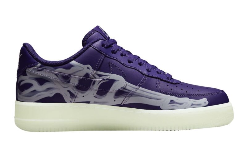 Following the Nike Air Force 1 Low “Skeleton” (Brilliant Orange) in 2020, the style returns this year as the Nike Air Force 1 Low “Purple Skeleton.”. Just like the aforementioned pair, this model is designed in celebration of Halloween and essentially reflective of the first skeleton edition from 2019. Overall, the sneaker sports the signature Skeleton x-ray print on its vibrant purple upper while resting atop a glow-in-the-dark rubber tooling.