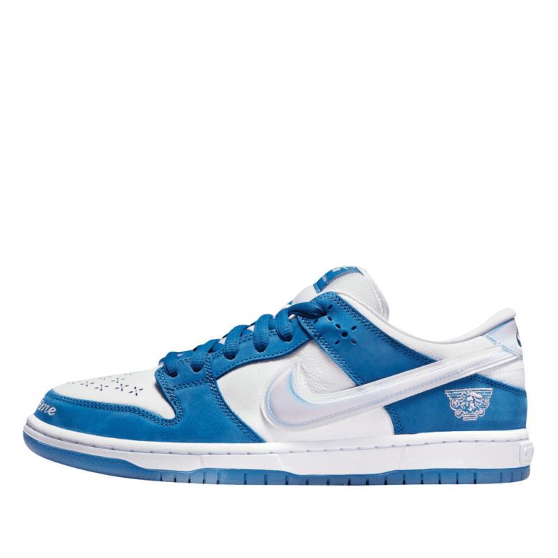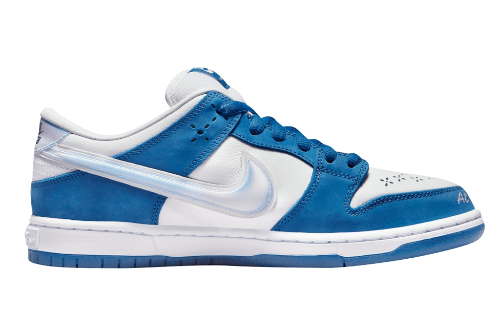 Los Angeles based brand Born x Raised joins forces with Nike to create and release a collaborative edition of the Nike SB Dunk Low. This Nike SB Dunk Low features a white premium leather on the majority of the upper which is then contrasted by blue nubuck on the overlays. Standout details include Born x Raised’s signature motto, “One Block At A Time,” embroidered on the forefoot and tongue tags, holographic Swooshes and heel tabs, “On The Turf” 3D text on the midsole’s heel as well as on the inner tongues, co-branded insoles, tongue tags, heels, and outsoles, and “In Loving Memory” heat pressed on the laces with Born x Raised branded lace tips. A white leather inner liner, an intricate design on the toe perforations and upper eyelets, and embroidered motif on the lateral ankles round out the look on this Born x Raised x Nike SB Dunk Low.