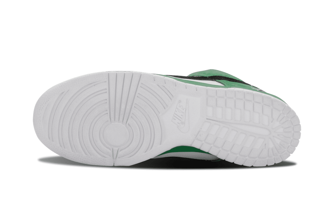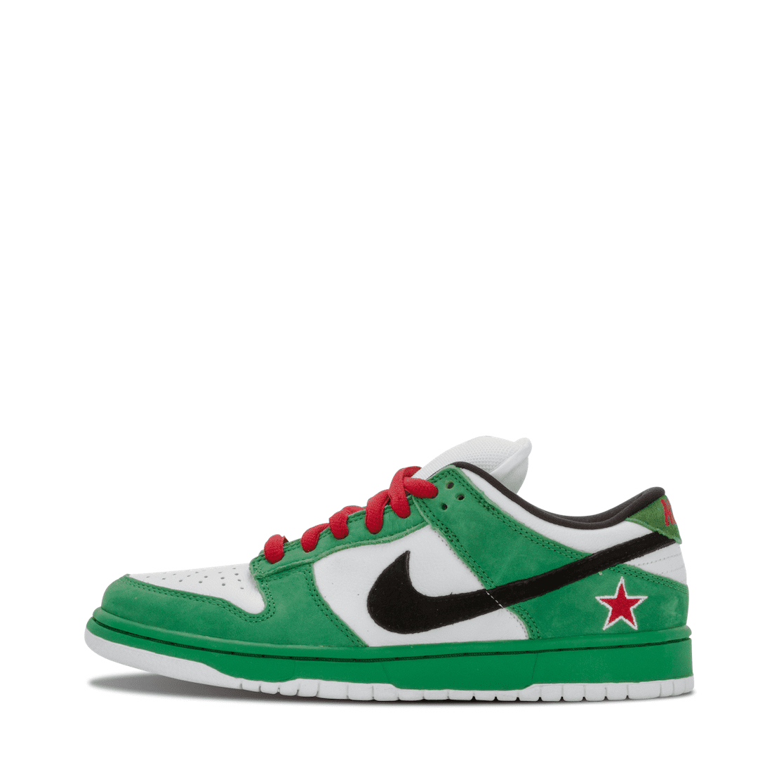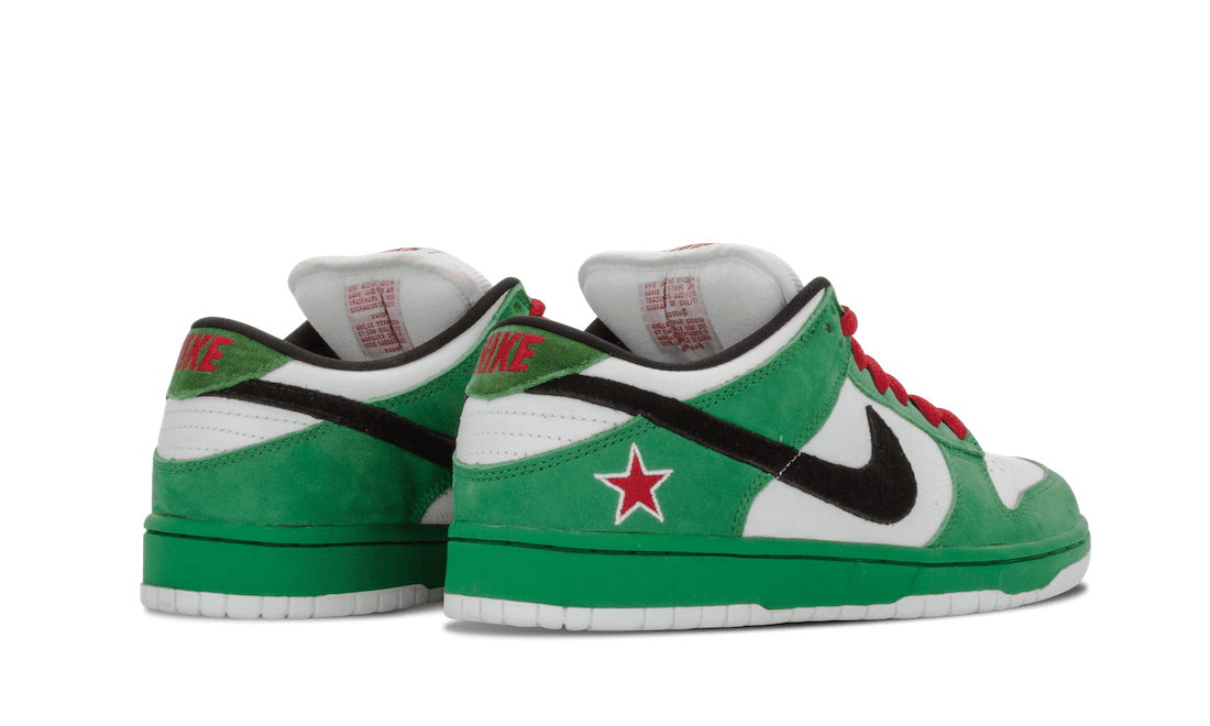 The Dunk Low Pro SB ‘Heineken’ takes inspiration from the unique green bottles used by the Dutch beer brand. The low top sports a white leather upper with green nubuck overlays and a black suede Swoosh. The color scheme across the upper is echoed across the tooling of the shoe, with a green midsole and crisp white outsole. Bordered in white, an embroidered red star adorns the side of the heel