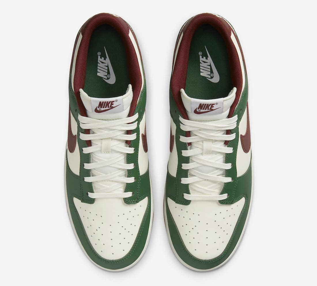Dressed in a mix of Gorge Green, White, Team Red, and Gum Medium Brown. This offering of the Nike Dunk Low comes constructed in a full leather build with mesh tongues and lining. It features a White base with Green and Team Red overlays atop a White midsole and Gum rubber outsole.