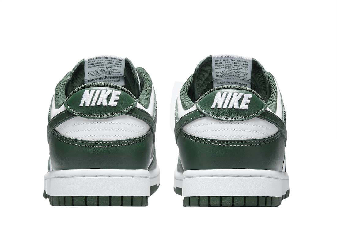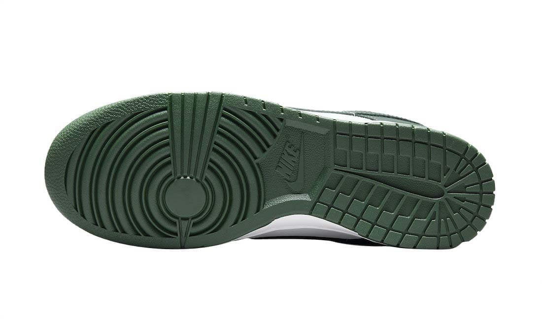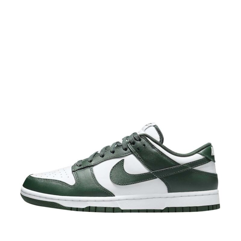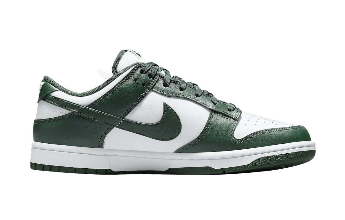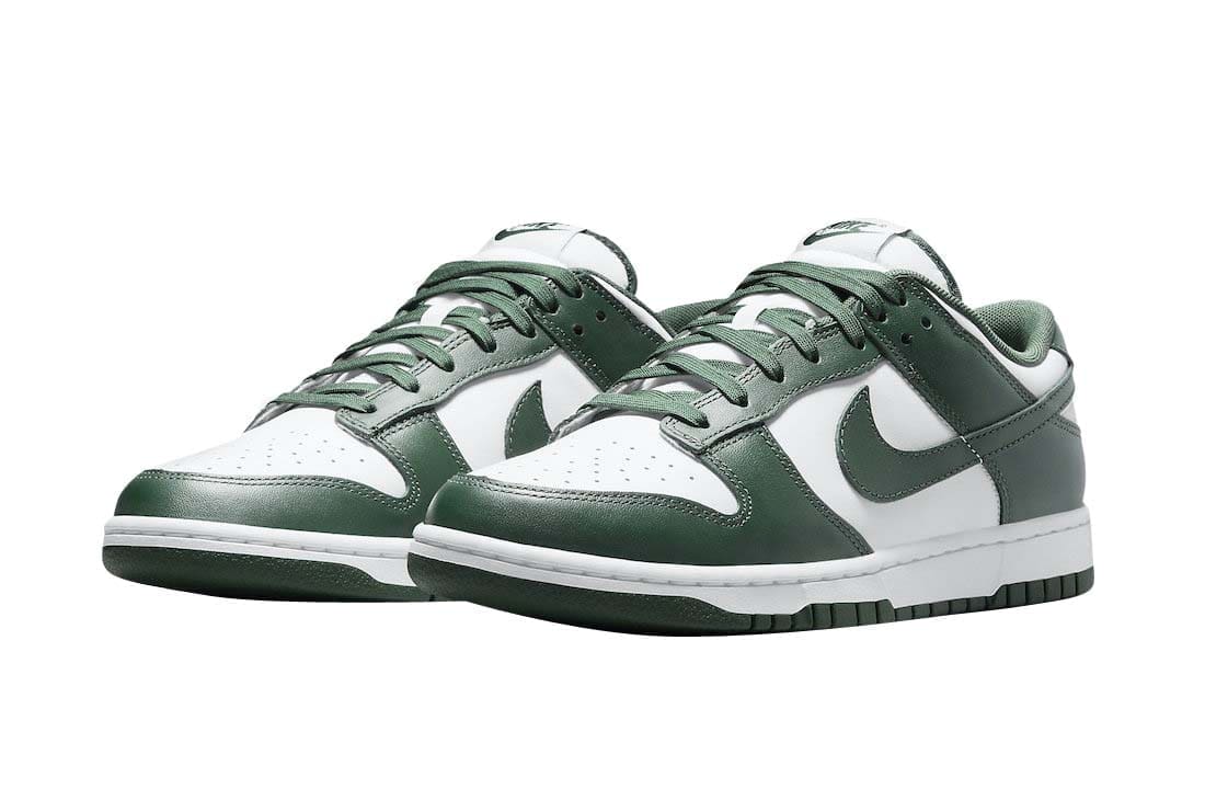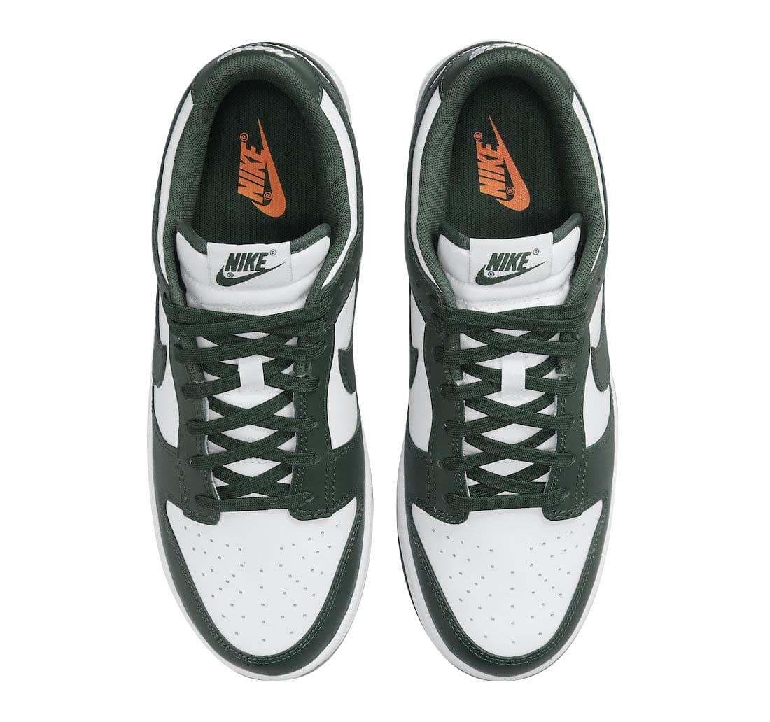 The Nike Dunk Low Varsity Green (aka Spartan Green) is done in an official color scheme listed as White/Team Green-White-Total Orange. It features a White leather upper contrasted by the Green on the overlays and Swoosh logos. The same two colors are used on the rest of the shoe, which includes the White midsole and Green on the outsole, laces and guts.