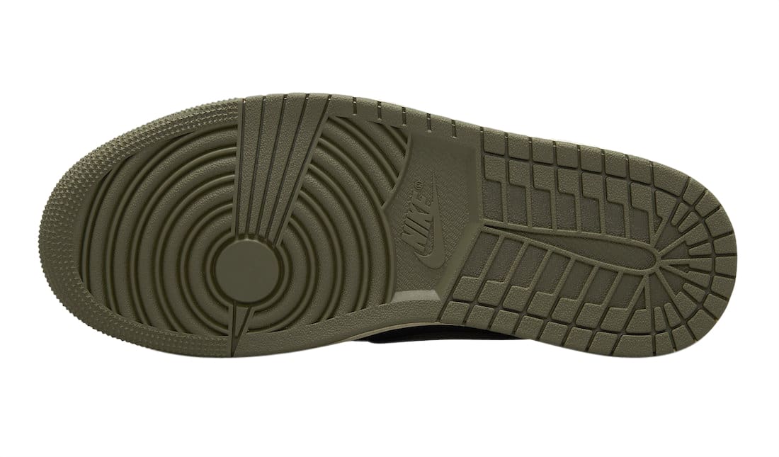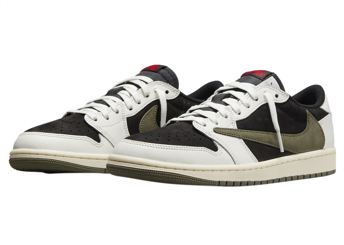 Dressed in a Sail, University Red, Black, and Medium Olive color scheme. This offering of the Travis Scott x Air Jordan 1 Low features a Black suede base with Sail leather overlays. Other details includes Olive suede Swooshes, laces, and “Cactus Jack” tongue branding with Red accents on the “Nike Air” tongue branding and embroidered heels. A Sail midsole atop an Olive rubber outsole with graphic insoles completes the design. The shoe will be available in extended sizing and comes housed in special packaging with extra set of laces.