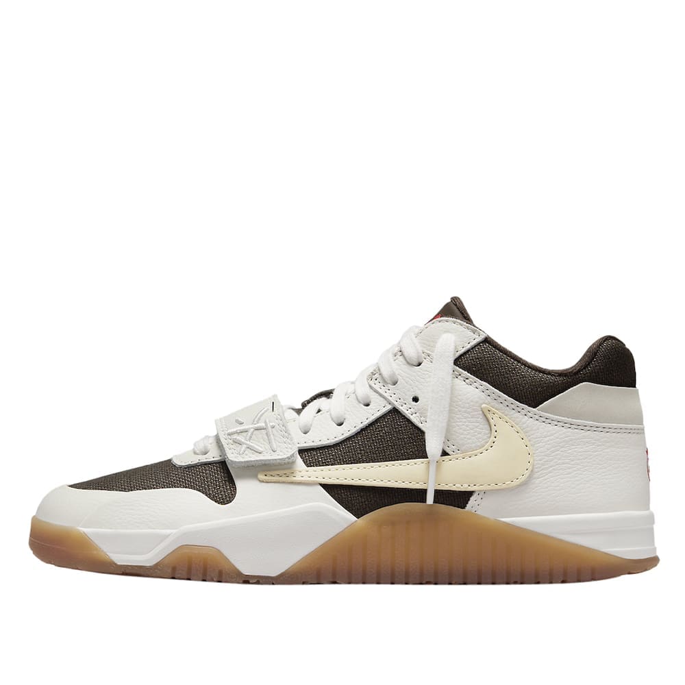 Staying true to Scott’s distinctive style, the shoe showcases his innovative design approach. The iconic backward Swoosh, a trademark of the rapper’s past Nike and Jordan collabs, is a focal point, complemented by a new branded strap. The overall design draws inspiration from renowned Swoosh classics while maintaining its own unique identity. The “Sail” edition boasts a Black base, White leather overlays, and a Gum rubber outsole with “Jack” branding beneath.