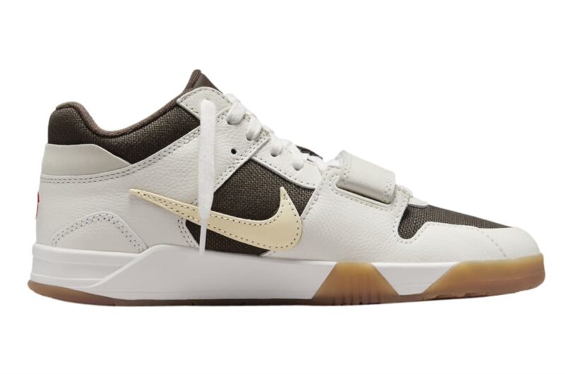 Staying true to Scott’s distinctive style, the shoe showcases his innovative design approach. The iconic backward Swoosh, a trademark of the rapper’s past Nike and Jordan collabs, is a focal point, complemented by a new branded strap. The overall design draws inspiration from renowned Swoosh classics while maintaining its own unique identity. The “Sail” edition boasts a Black base, White leather overlays, and a Gum rubber outsole with “Jack” branding beneath.